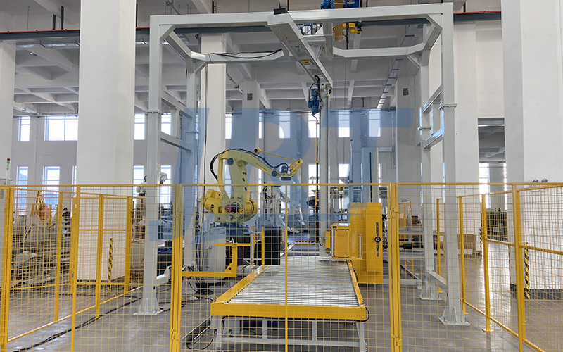 无纺布自动包装线集软件系统、周转搬运、生产线合流、机器人自动码垛、自动放纸板、自动缠膜打包、自动覆顶模、自动尼龙袋缠绕包装、自动称重、自动打印标贴、自动翻转下线、自动入库、立体仓库等流程。